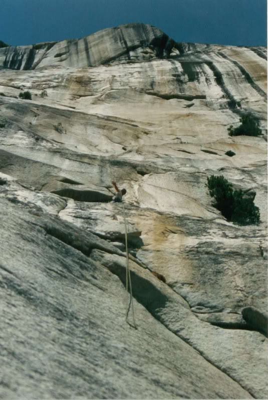 Yvon comenzó con un difícil e incómodo largo en curva hacia la derecha, tras el filo del pilar. Tras unirnos a él, decidí descender unos metros y pendulear de vuelta al lado izquierdo del pilar. Escalé una fisura en chimenea offwidth, en los límites de mi grado en libre, y con ello ahorramos varias clavijas bong para lo que pudiera venir. Tras varios tremendos esfuerzos para superar unos arbustos, fui capaz de montar una reunión sobre estribos. Aquella mañana teníamos dos litros de agua para los tres, y Harding había tomado la decisión de no beber nada aquel día, para dejar el agua para el equipo que formábamos Yvon y yo, de escalada aquel día. Su sacrificio mostraba el enorme coraje y disciplina de este escalador, raramente igualado por nadie de la zona.